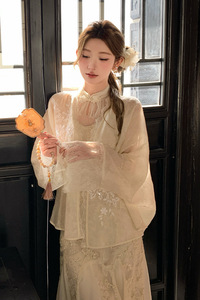 NMIOK 白色国风蕾丝拼接旗袍连衣裙刺绣披肩女早秋气质穿搭裙套装