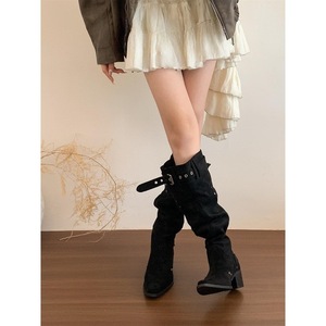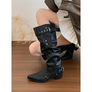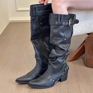 5CMC粗跟~复古大筒围长筒靴女秋不过膝尖头显瘦皮带扣褶皱堆堆靴