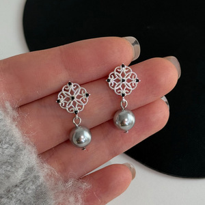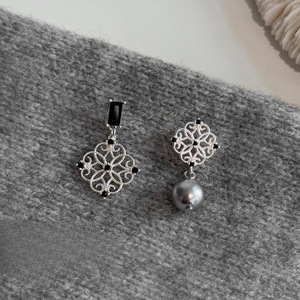 S925纯银清冷感新中式灰珍珠轻奢小众气质不对称高级感古风耳饰女