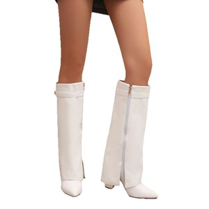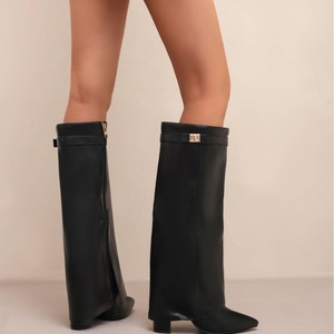 外贸尖头大筒围直筒金属扣中长筒靴子大码粗跟裤管靴女靴增高显瘦
