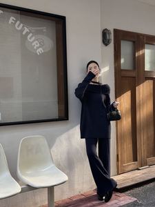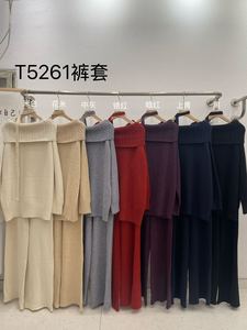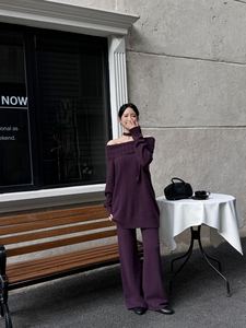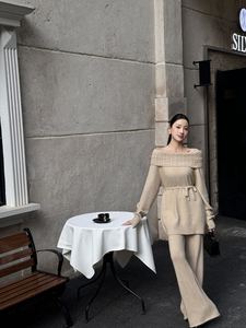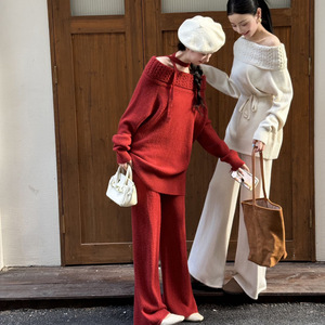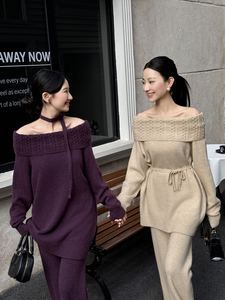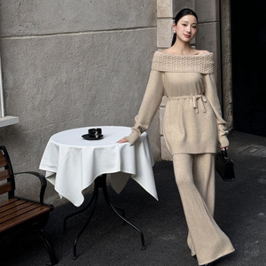 时尚气质高级感女士两件套秋冬新款一字肩麻花上衣宽松阔腿裤套装