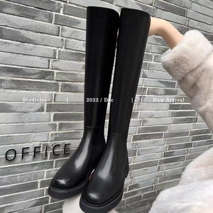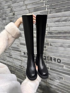 牛皮葡萄妈同款厚底小个子中长筒靴子弹力骑士靴女秋冬真皮高筒靴