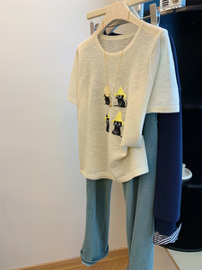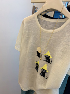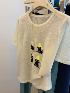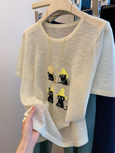 杏色正肩针织短袖猫咪刺绣t恤女夏季罩衫薄款微透气质上衣设计感