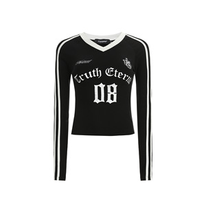 浅耀女装|美式复古v领运动球衣长袖T恤女款潮牌辣妹修身显瘦上衣