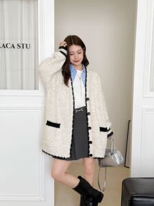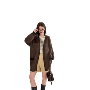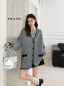 秋冬新款法式小香风中长款拼色宽松毛衣软糯慵懒女式针织开衫外套