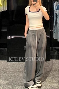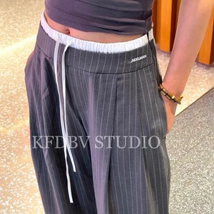 2025早秋AN王心凌同款时髦撞色拼接腰头条纹休闲裤西装阔腿长裤