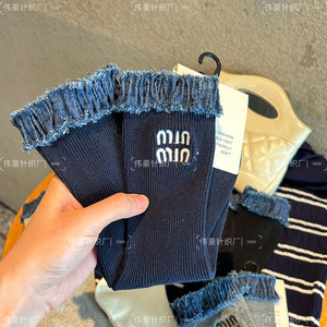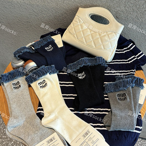 早秋新款欧货牛仔复古中筒袜ins风JK甜美日系净版字母堆堆袜长袜