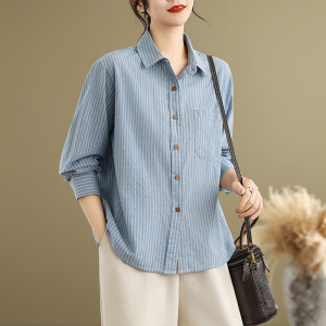 纯棉条纹衬衫女翻领休闲百搭宽松显瘦秋季新款韩版长袖衬衣