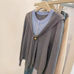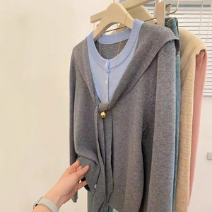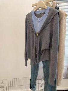 灰色假两件长袖针织衫女士薄款新款高级感上衣早秋氛围感穿搭ins