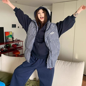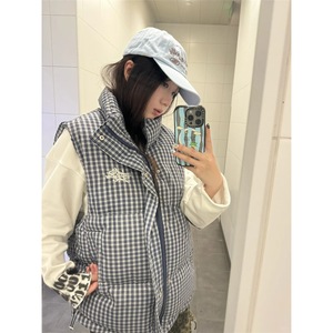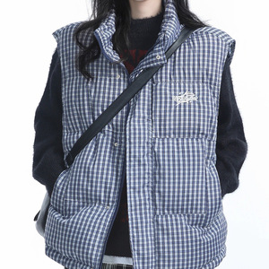 美式棉服羽绒棉马甲刺绣潮牌复古格子棉衣外套男女款立领加棉马夹