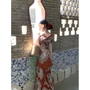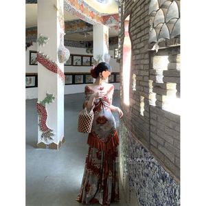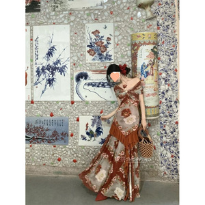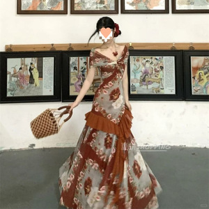 法式气质复古碎花拼接一字肩短袖连衣裙女夏季收腰显瘦包臀长裙子