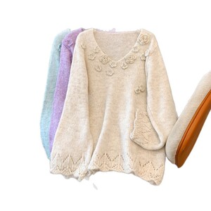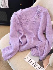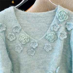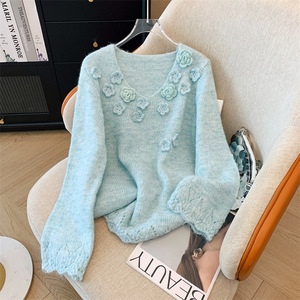 氛围感立体花朵V领长袖毛衣女2025秋冬季新款宽松套头别致针织衫