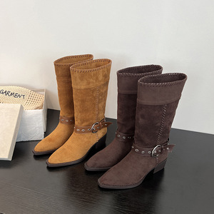 西部牛仔靴复古粗跟短靴切尔西马丁靴绒面秋冬英伦风靴子中筒扣带