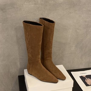 内增高尖头绒面瘦瘦中筒长靴女鞋2025秋冬季加绒棕色长筒骑士靴子