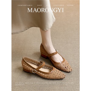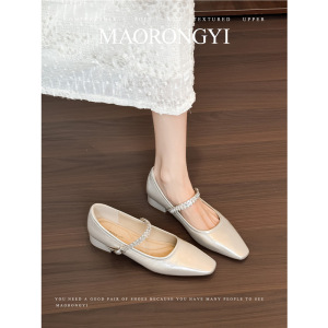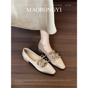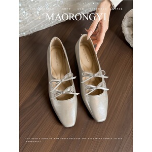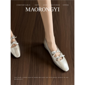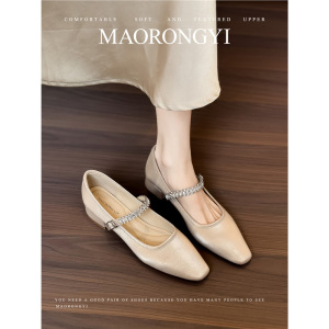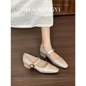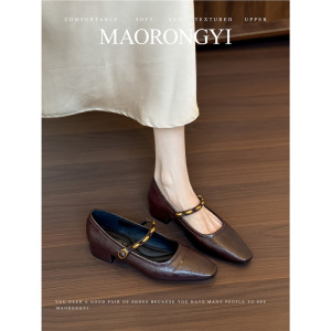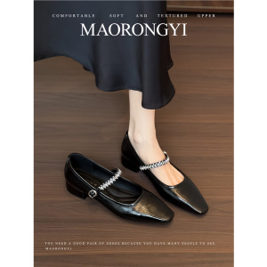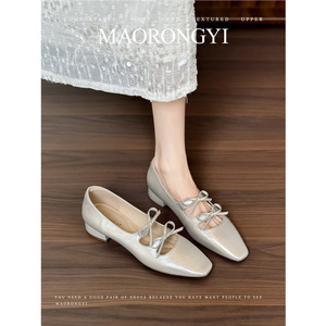 毛容易复古一字式扣带方头软底真皮粗跟单鞋女鞋玛丽珍蝴蝶结女鞋