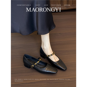 毛容易复古一字式扣带方头软底真皮粗跟单鞋女鞋玛丽珍蝴蝶结女鞋