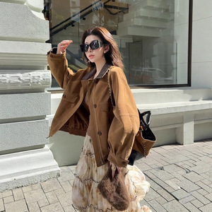 美式复古设计感做旧翻领夹克女2025秋季新款撞色拼接收腰显瘦外套
