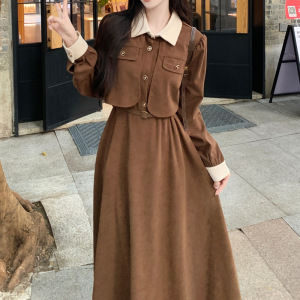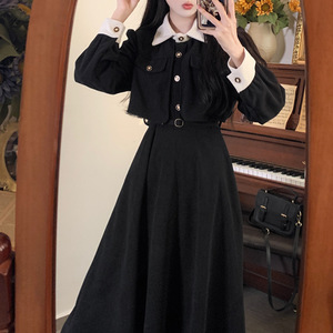 大码法式高级感磨毛长袖假两件连衣裙秋冬收腰显瘦长裙赫本小黑裙