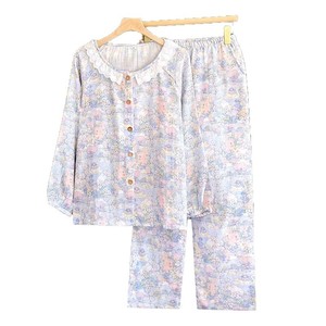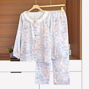双层棉纱睡衣女圆领蕾丝花边甜美家居服清新长袖长裤睡衣套装现货