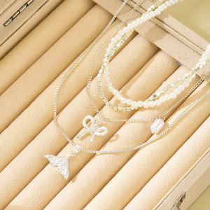 镶钻鱼尾蝴蝶结吊坠批发欧美跨境轻奢高级感项链女叠戴仿珍珠项饰