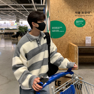 秋冬新款POLO衫翻领条纹针织衫毛衣男宽松慵懒风外套外贸跨境批发
