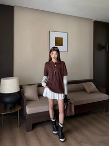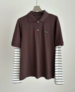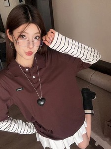 25早秋MM系字母拼接撞色刺绣假两件长袖T恤女新款学院风polo上衣