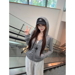 新品亚马逊欧美韩系薄款条纹拉链连帽长袖外套女夏季修身显瘦开衫