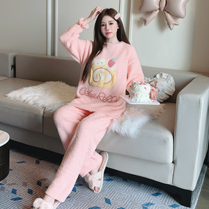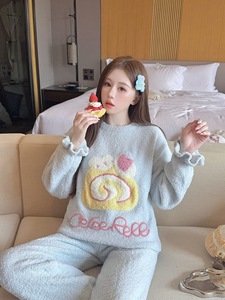 日系甜美荷叶袖睡衣女冬季加厚保暖半边绒少女家居服套装可外穿