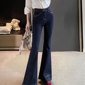 丹宁蓝高腰微喇牛仔裤女秋冬加绒修身弹力显瘦喇叭裤小个子拖地裤