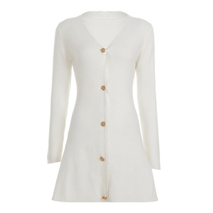 法式气质优雅V领纯色玫瑰扣长袖连衣裙女亚马逊修身A摆毛织连衣裙