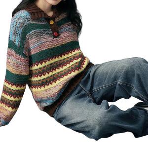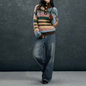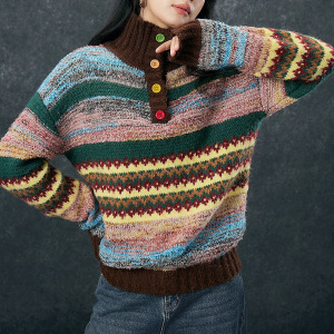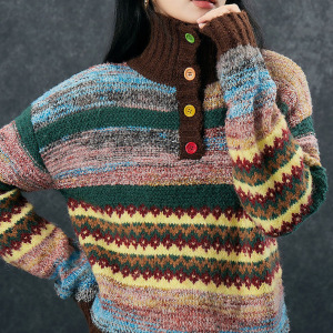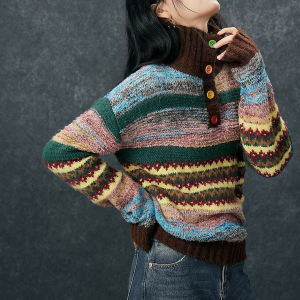 2025韩版复古彩色纽扣高领套头冬季新款宽松针织女上衣拼色设计