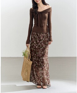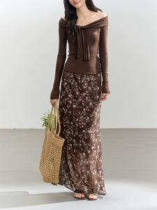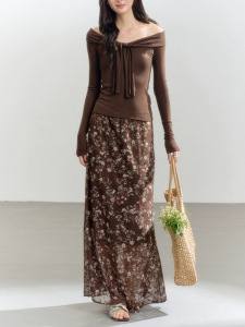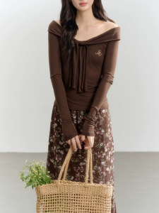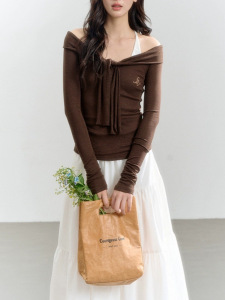 绑带一字肩棕色修身长袖衣女针织别致露肩飘带短T恤