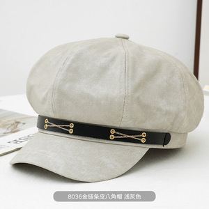 秋冬韩系棕色PU皮八角帽女士英伦显脸小复古潮流贝雷帽画家帽批发