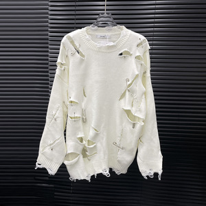 2025秋新款圆领别针潮流破洞套头长袖街头风纯色针织衫