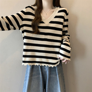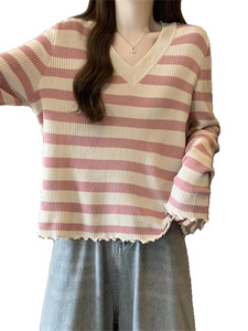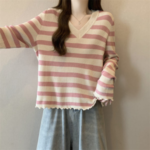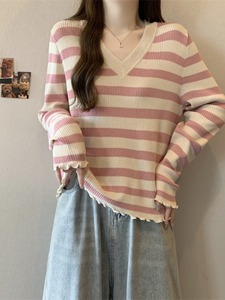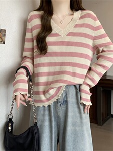 韩版时尚领条纹设计针织衫女秋季大码胖宽松遮肉百搭长袖上衣