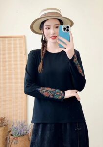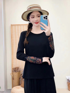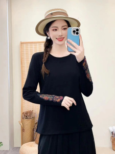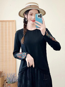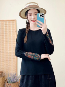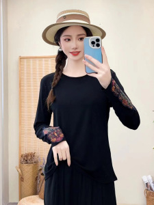 2025秋冬国风刺绣内搭纯色圆领宽松绣片女士打底衫