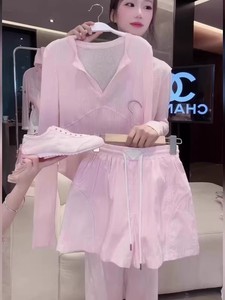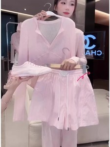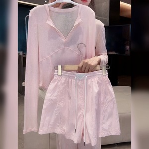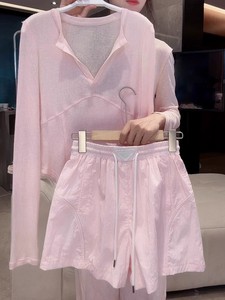 粉色爆款设计感甜美气质V领长袖上衣女短裤百搭薄款显瘦两件套