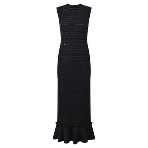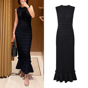 2025秋季新款花边水钻气质优雅修身黑色圆领无袖长款鱼尾连衣裙