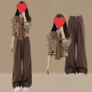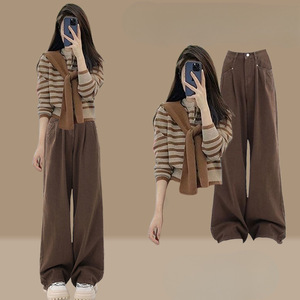 秋季套装女2025新款时尚复古洋气减龄披肩条纹针织衫阔腿裤三件套