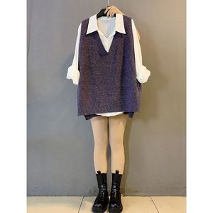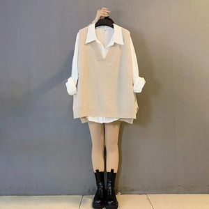 胖mm大码女装秋季新款净版宽松显瘦针织马甲职业百搭衬衫两件套装