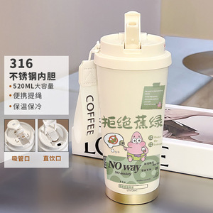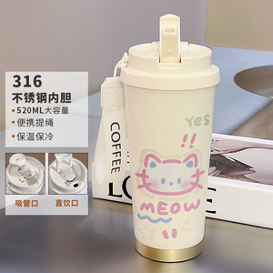 不锈钢内胆咖啡杯卡通有提绳带吸管保温杯女生可爱凯蒂便携随行杯