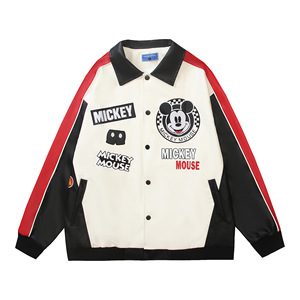 美式复古拼色趣味卡通刺绣翻领皮夹克男秋冬宽松休闲潮流情侣外套