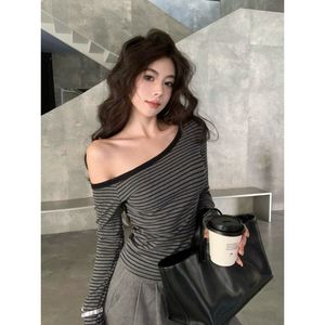 设计感斜肩条纹长袖T恤女春秋美式辣妹修身内搭露肩打底衫短上衣