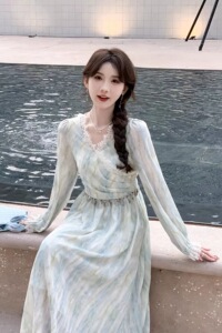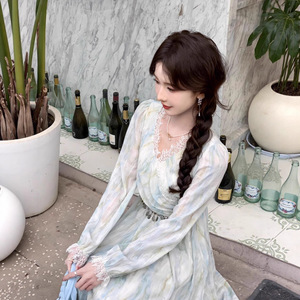 法式温柔风v领长袖连衣裙子女早春季高级感气质海边度假仙女长裙