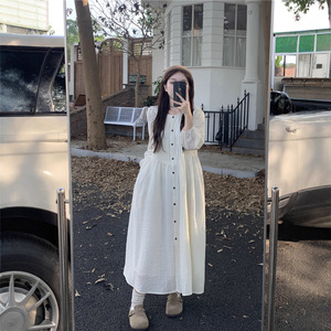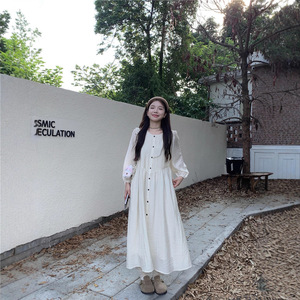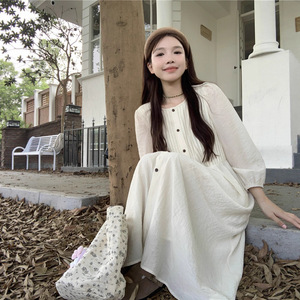 秋装2025系褶皱长袖连衣裙女装新款设计感高腰宽松中长款A字裙子