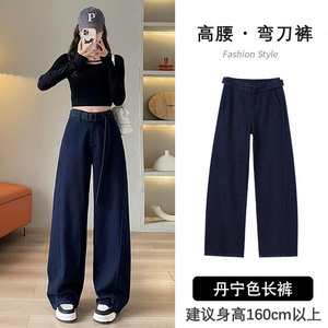 丹宁蓝阔腿牛仔裤女秋季2025年新款高腰宽松垂感弹力超火弯刀裤子
