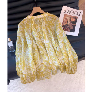 法式黄色印花v领亚麻长袖衬衫女夏新款宽松显瘦气质轻薄防晒上衣