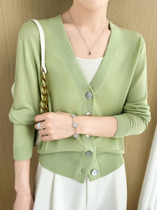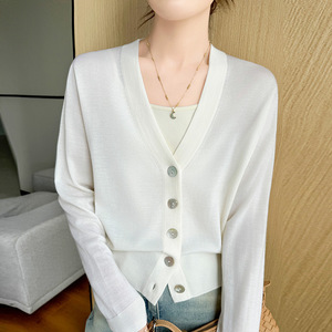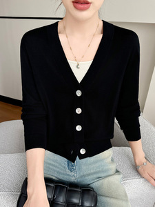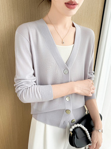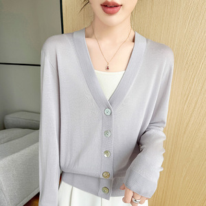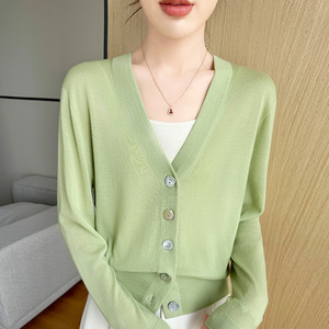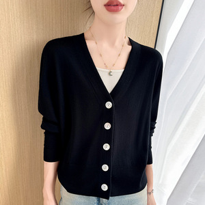 2025早秋新款18针精纺羊毛开衫女V领毛衣外套宽松休闲薄款上衣