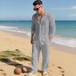 跨境欧美亚麻秋季男装套装沙滩休闲宽松翻领衬衫长袖长裤套装男