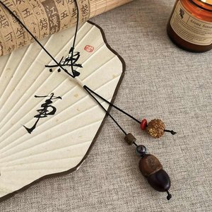 咖色相机吊坠串珠木月牙黑色皮绳项链